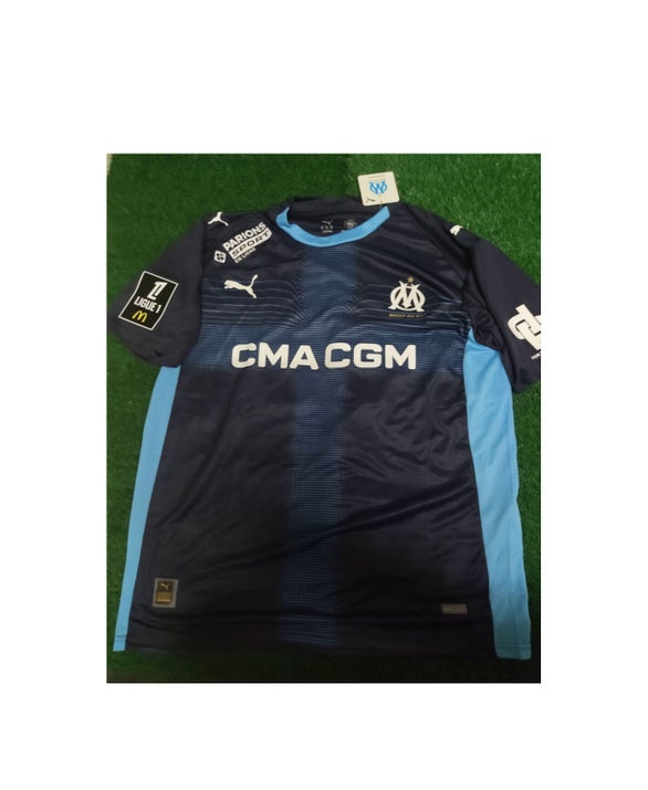 Montrons Notre Soutien sans ambigüité aucune à l’Olympique de Marseille hors de Chez Nous avec le Maillot Officiel Extérieur de cette nouvelle saison. Ce maillot bleu nuit valorise "L’Armée des Marseillais" et rend hommage aux tifos de « Notre Vélodrome ». Son design, par le biais des lignes graphiques dessinant la croix phocéenne, symbole fort de Marseille, est le reflet de l’histoire et de l’ADN conquérant de la Ville.
