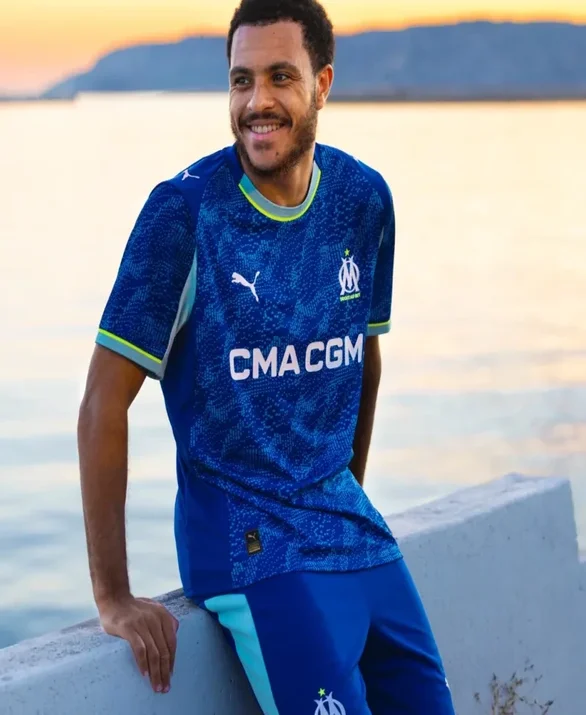 Le maillot Third OM 2025-2026, rend Hommage à la mer Méditerranée et aux dockers marseillais. Ce nouveau maillot Marseille crée un lien unique entre le club phocéen et l’identité maritime de la Cité. Il se distingue par sa couleur bleu mer Méditerranée dominante, créant un lien direct avec l’identité maritime de Marseille. Ce design s’inspire des reliefs et ondulations de la mer, avec un motif graphique moderne qui évoque les mouvements aquatiques.