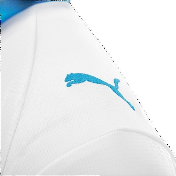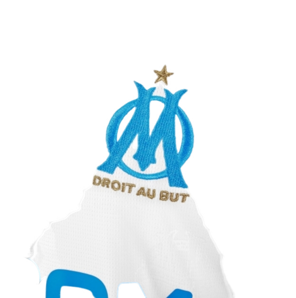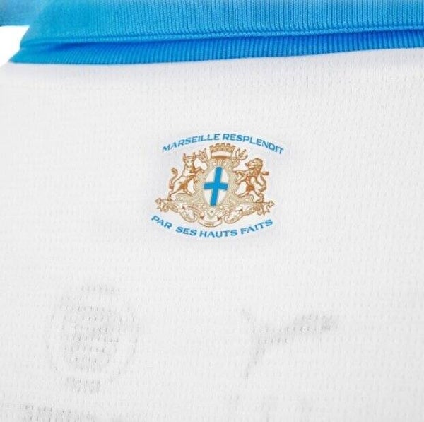 Le Maillot Domicile de cette saison allie à la fois la Perfection, l’Historique et la Fierté de tout un Peuple. En effet, son apparence honore la mémoire collective olympienne de par la mise en valeur en surbrillance des dix anciens logos de L’OM sur du tissu blanc, le tout mis en valeur par l’accentuation du traditionnel bleu ciel.